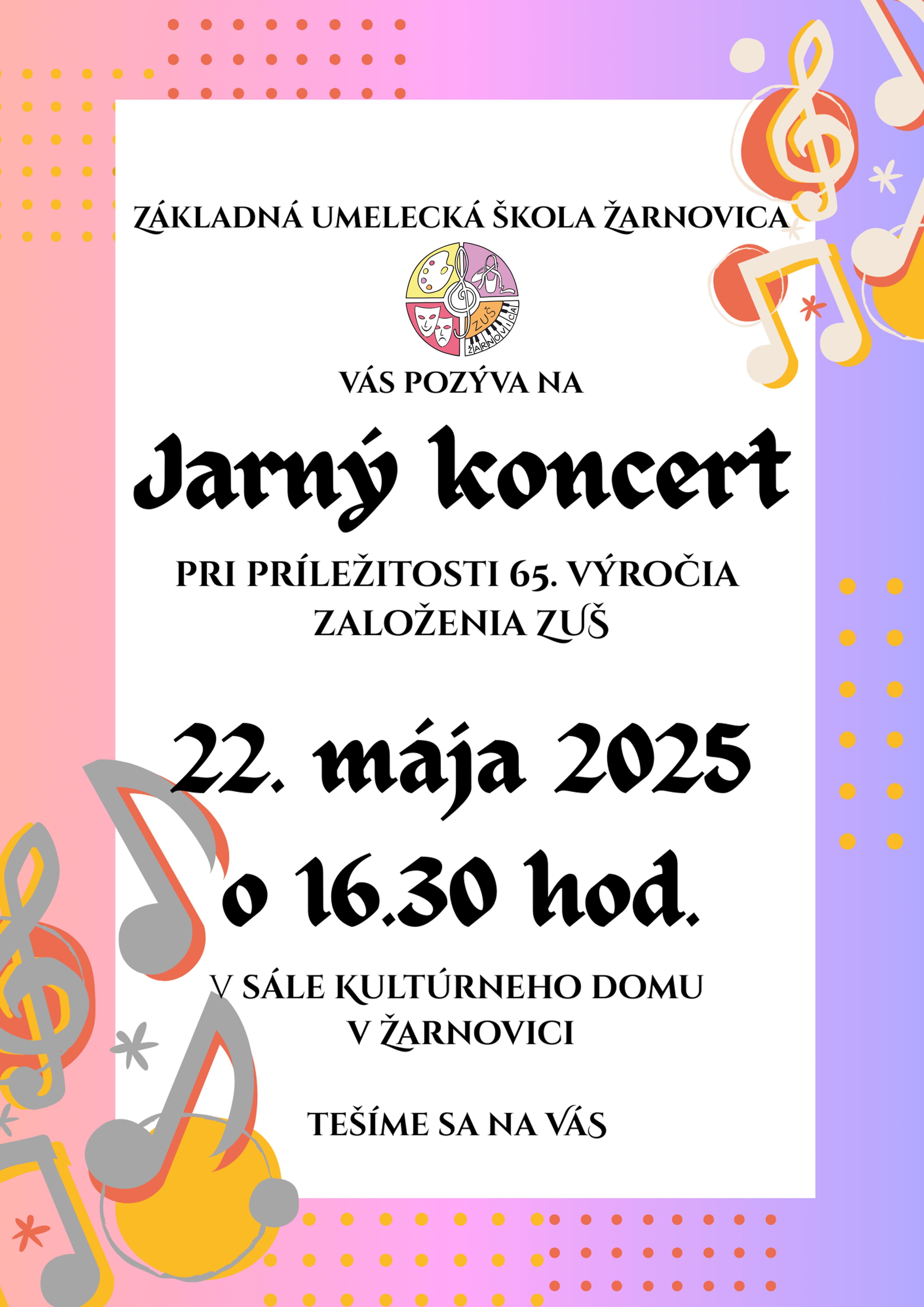 Srdečne Vás pozývame na tradičný Jarný koncert venovaný 65. výročiu založenia Základnej umeleckej školy v Žarnovici, ktorý sa uskutoční 22. mája 2025 o 16.30 hod. v sále Kultúrneho domu v Žarnovici. Môžete sa tešiť na bohatý program žiakov hudobného, tanečného a literárno-dramatického odboru a výstavu prác žiakov výtvarného odboru a my sa tešíme na Vás. 🙂